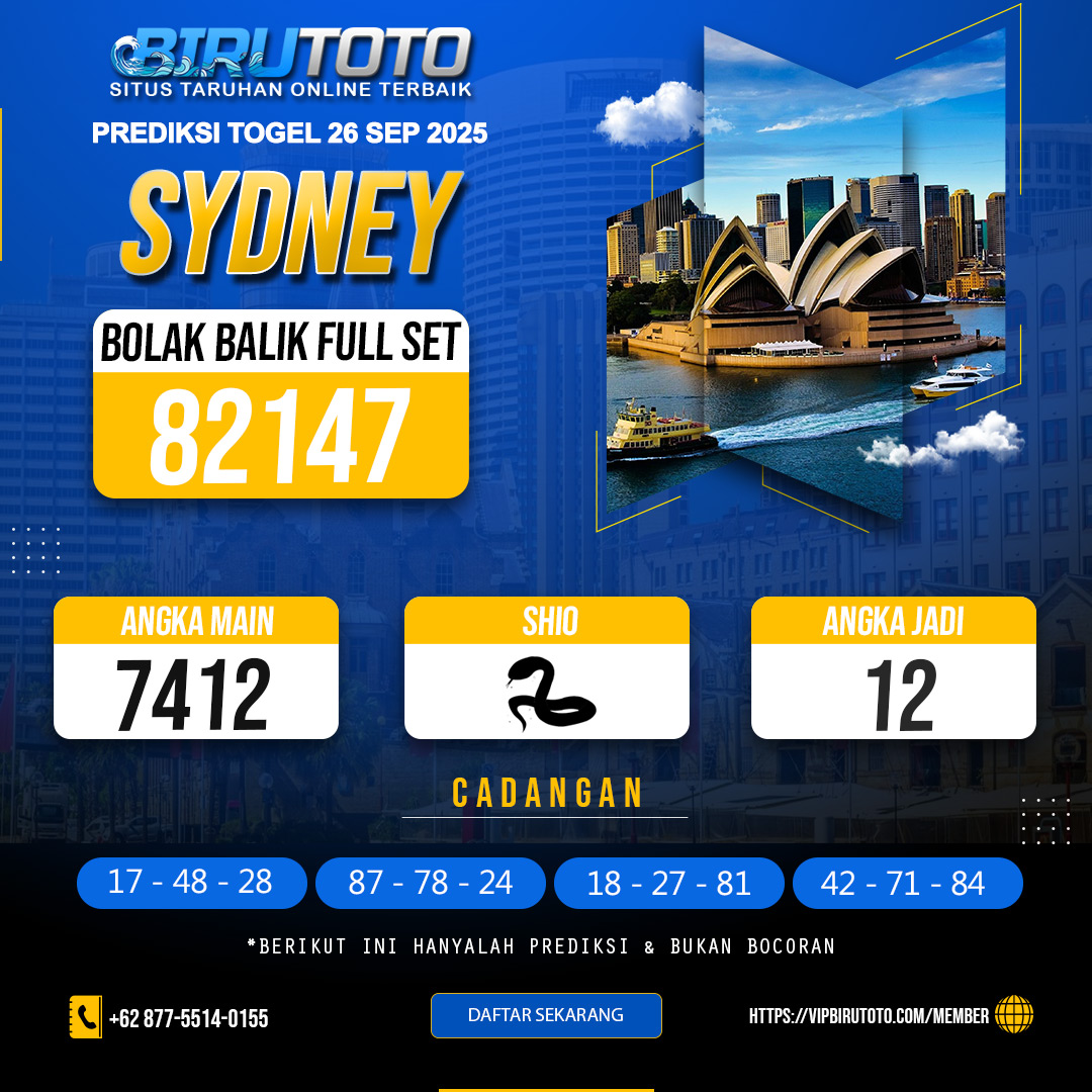 Prediksi togel SYNDEY jitu akurat dari kami tentu sudah kami tentukan dengan rumus variabel atau sistem matematika yang tentunya rumus tersebut akan sangat panjang jika di uraikan, maka dari itu disini kami langsung mengurainya menjadi sebuah prediksi togel jitu serta paling lengkap dan angka invest dan angka jitunya. Ayo daftar dan deposit sekarang juga untuk mendapatkan jackpot besar bersama birutoto !