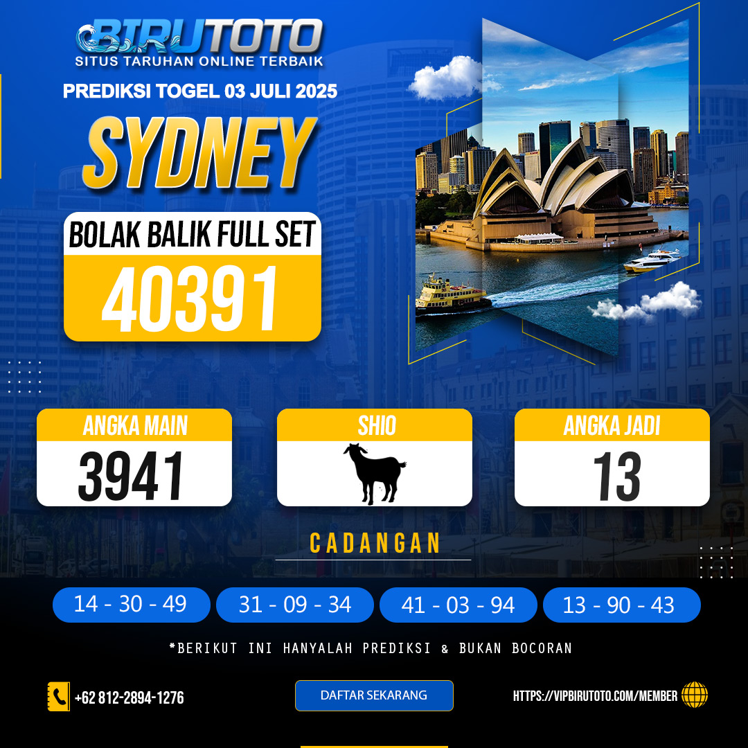 Prediksi togel Sydney jitu akurat dari kami tentu sudah kami tentukan dengan rumus variabel atau sistem matematika yang tentunya rumus tersebut akan sangat panjang jika di uraikan, maka dari itu disini kami langsung mengurainya menjadi sebuah prediksi togel jitu serta paling lengkap dan angka invest dan angka jitunya. Ayo daftar dan deposit sekarang juga untuk mendapatkan jackpot besar bersama birutoto !