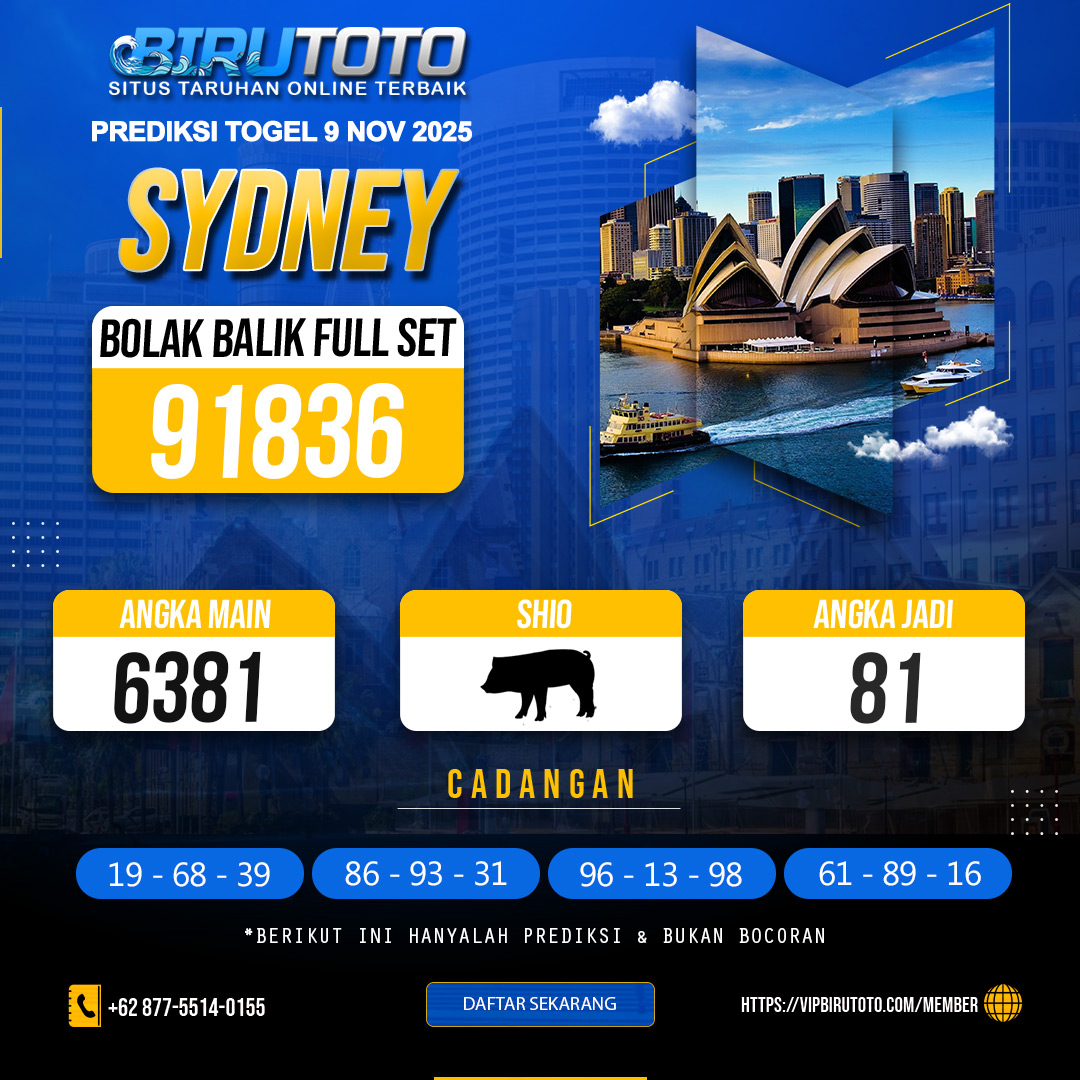 Prediksi togel SYNDEY jitu akurat dari kami tentu sudah kami tentukan dengan rumus variabel atau sistem matematika yang tentunya rumus tersebut akan sangat panjang jika di uraikan, maka dari itu disini kami langsung mengurainya menjadi sebuah prediksi togel jitu serta paling lengkap dan angka invest dan angka jitunya. Ayo daftar dan deposit sekarang juga untuk mendapatkan jackpot besar bersama birutoto !